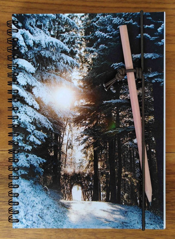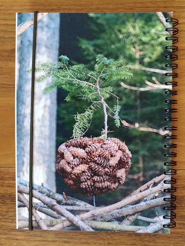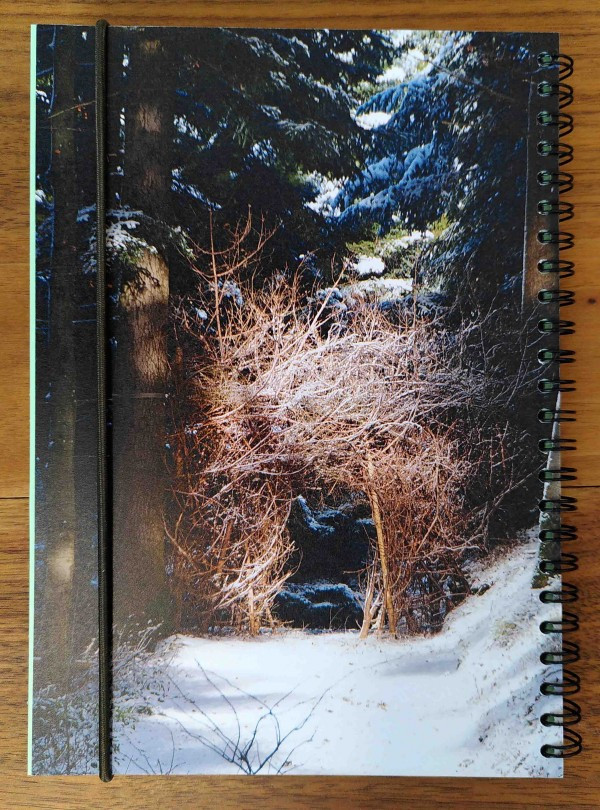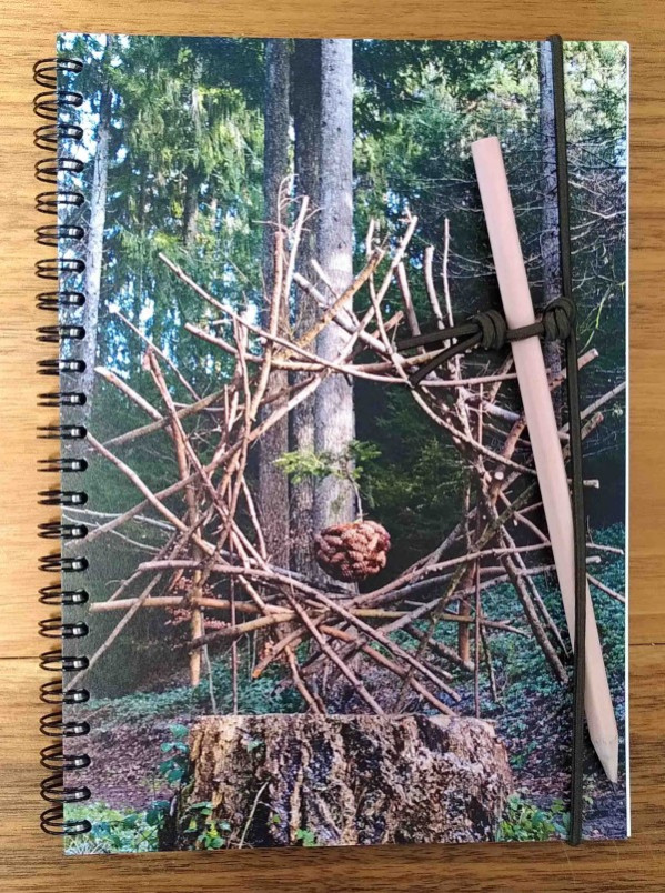 - Notizbuch zur Freiluftausstellung "Gedankenspiele" (A5 hoch) inklusive Holzbleistift, Vor- und Rückseite bedruckt, gefüllt mit verschiedenen Spezialpapieren, jedes Stück ein Unikat. Stk. Fr. 20.-