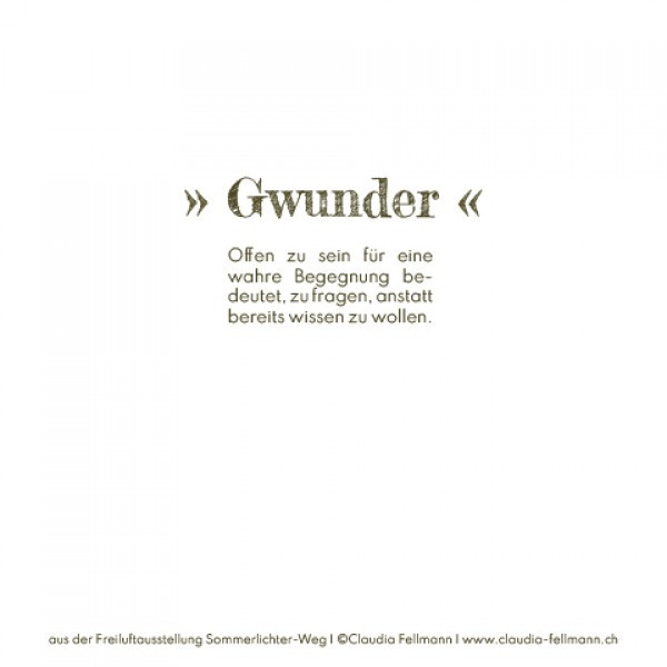 - Quadratische Faltkarten zu den Freiluftausstellungen "Sommerlichter-Weg" und "Gedankenspiele" (14.8 mal 14.8 cm) Text auf der Rückseite, inklusive Couvert: Stk. Fr. 5.50
